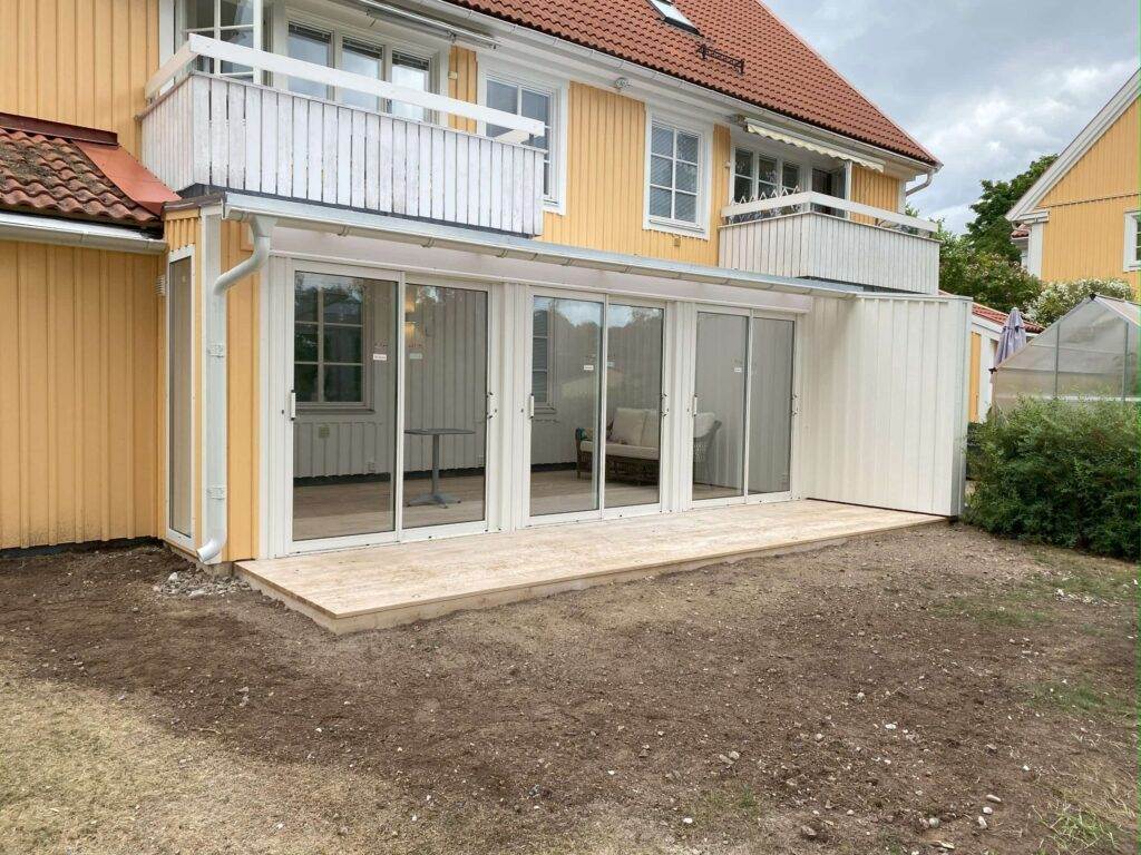 I detta projekt byggde vi ett uterum designat för året runt-användning. Taket består av ett 50 mm kanalplasttak, vilket ger hög isoleringsförmåga och ökad bärighet. Detta tak är särskilt anpassat för vinterförhållanden och minimerar risken för kondensdropp. Vi installerade glaspartier av hög kvalitet för att bibehålla ett bra inomhusklimat och släppa in mycket ljus, även dessa anpassade för vinterförhållanden. För golvet valde vi OrganoWood, en miljövänlig trall som tål väder och vind samtidigt som den ger en varm och naturlig känsla. Detta uterum erbjuder en trivsam plats för avkoppling och samvaro, oavsett årstid.