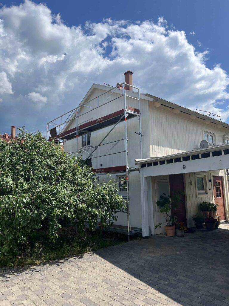 I detta projekt genomförde vi ett panelbyte på två gavlar på en villa. Vi började med att ta bort den gamla panelen och inspektera underliggande konstruktion för eventuella skador eller röta. Efter att ha säkerställt att allt var i gott skick, installerade vi ny, hållbar panel som gav huset ett fräscht och uppdaterat utseende. Detta arbete förbättrade både husets estetik och skydd mot väder och vind.